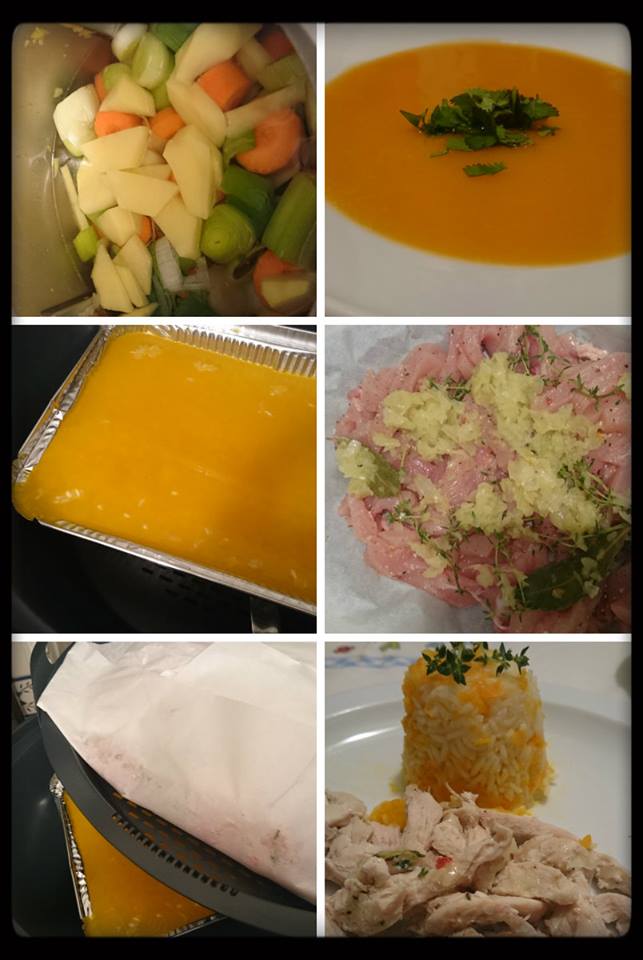 Creme de legumes com arroz de cenoura e peitos de frango ao vapor.